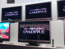 ブース前面では、赤色レーザー光源とシアンLEDを組み合わせたバックライトを採用することで赤色の表現性や色域を拡張した55V型液晶テレビ「REAL LASERVUE(リアルレーザービュー)」を大きくアピール。