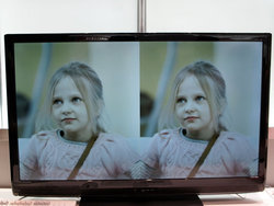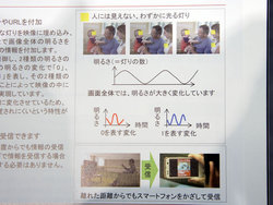 富士通研究所によって6月に技術発表が行われたもの(関連ニュース)を実際にデモで体験できる。同技術は光の点滅で0/1の情報を送信する「可視光通信」と、映像にノイズを加えて0/1の情報を伝える「電子透かし」のハイブリッド構成。映像に微小な灯りを埋め込み、その微小な灯りの数を増滅することで、光通信のような明暗を緩やかに発生させ、情報を送信する。