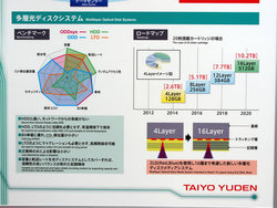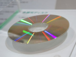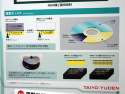 太陽誘電ブースでは、NHK技研公開でも展示されていた超薄型の光ディスク高密度記録技術(関連ニュース)の展示も見られた。同社が光ディスクを提供したものだという。