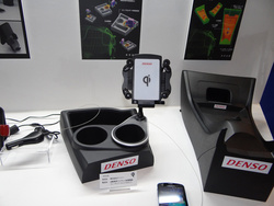 今回はDENSO、LITE-ONの両社から車載用のQi対応ワイヤレス給電器が参考展示された。ひとつは車内のアームレストボックス等に配置可能な、トレイタイプの組み込み型給電器。展示スタッフによれば「アフター市場で展開できるよう簡易に取り付けが可能な設計にしている」という。もうひとつ、クレイドル型給電器の試作品も展示されていた。