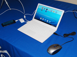 韓国KT社がすでに商品化している「SPIDER LAPTOP」もMHLに対応している。本体にはディスプレイとキーボード、インターフェース、電源のみを搭載。スマートフォンとMHL接続することで、スマートフォンのOSやアプリを使ってノートPCのような感覚で本体を操作できる、ディスプレイ付きキーボードのようなユニークな製品。本機からスマートフォンへの充電も行える。