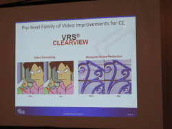 4K2KサポートするビデオプロセッサーのICサンプルも発表された。同社では2011年にアンカーベイ社を買収し、協力関係を築きながら「VRS ClearView」技術を開発し、製品へ搭載してきた。新しいICチップでは、HD/SD映像のリアルタイム4Kアップスケーリングを実現。独自のアルゴリズムによる高精細化処理も行う。チップ内部のメモリーだけでスケーリング処理を行える点が特徴という。同社では今後、本製品を次世代のホームシアターアプリケーション製品向けに提案していく。