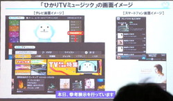 今年12月に向けた取り組みとして、新サービス「ひかりTVミュージック」の提供を発表した。「価格、楽曲ラインナップともにご満足いただける定額制音楽配信サービス」を目指したとのことで、数百万曲以上を目標にコンテンツを揃え聴き放題のサブスクリプション型で配信し、充実した邦楽から洋楽までをラインナップ、スマートフォン(iOS/アンドロイド対応)、PC、ひかりTV対応チューナー搭載テレビに向けたマルチデバイスサービスとして展開する。