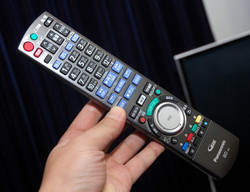 付属リモコンはRF方式の無線リモコンを採用。十字カーソル部をホイールパッド部と分離し、ボタン化した「新ホイールパッドリモコン」を同梱する。ホイールパッドは押し込むと「決定」、フリックで「ページ切換」、表側をジョグダイアルのように回転しながらなぞると、高速上下スクロールや再生中の特再操作が可能になる。