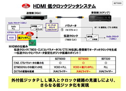 本機とAVアンプをHDMI接続した際に、より高精度な音楽再生を可能にする「HDMI 低クロックジッタシステム」も採用。本機側から伝送クロックとパラメータをアンプに送り、アンプ側でオーディオクロックを生成。低ジッタPLLを導入し、クロック経路も見直しを図ったことで、さらにジッターを押さえ込んだサウンドを実現している。