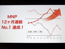 「電波のつながり」では、800MHz帯でのネットワークという点に言及。「『プラチナ』とは言いたくないが…、『レアメタルバンド』では意味も分からないので、英語ではゴールデンバンドと言っている」とソフトバンクを意識した言葉で会場の笑いも誘いながら「一番いい電波でつながるということを提供していく」とした。