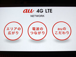 そしてLTEについては「単に新しいネットワークサービスを始めるという単純なものではない。本気のネットワークか否かというテーマをアピールしていきたい」とコメント。「エリアの広がり」「電波のつながり」「auのこだわり」という3点で同社LTEサービスの優位性をアピールする。