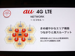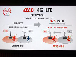 「auのこだわり」では、ピコセル(小型)基地局を4G LTEでも積極的に活用することで電波の弱いエリア対策を行っていくことなどを紹介。LTEから3Gへとデータ通信をシームレスに切り替える新技術「Optimaized Handover(オプティマイズド ハンドオーバー)」によって通信のとぎれを最小限にできることも紹介する。