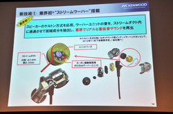 本機にはJVCケンウッドの独自開発による2つの大きな基幹技術が投入されている。新開発の重低音再生用ユニット「ストリームウーファー」と、これに中高音用ユニットを組み合わせることによって、リアルな重低音と高解像な中高域の両立するサウンドを実現させる「ライブビートシステム」だ。