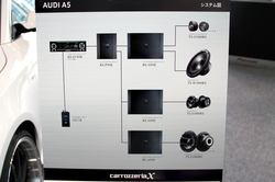 UDXに構えられたブースでは、カーオーディオをアピール。AUDIの「A5」に、RS-D7X III(メインユニット)やRS-P99X(デジタルプリアンプ)などをインストールしたフラグシップシステムが用意され、試聴を行うことができる。