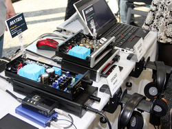 D/Aコンバーター部に「AD1955」、アンプ部に「AD8620」を搭載している。パーツにもこだわり、ニチコン製コンデンサーやALPS製のポテンションメーターを採用している。周波数特性は20Hz〜20kHzで、SN比は112dB、ダイナミックレンジは118dB。バッテリーで約8時間の連続駆動に対応する。今回のポタフェスでは、オンズが取り扱うGRADOのヘッドホンと組み合わせて試聴が行える。