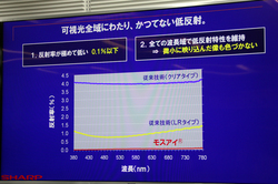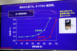 同社説明員によれば、前述のとおり4Kテレビへの応用も可能という。しかしスマートフォンやタブレット端末への搭載については「表面に細かな凹凸があるという構造上、触ることによる汚れなどの影響が考えられる。また、耐久性についても現在のモスアイパネルより向上させる必要があるだろう」と語っていた。