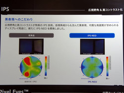 なお、イノベーションビークルに使用されている新型IPSは「IPS-NEO」というもの。低視覚域からも沈んだ黒表現ができるようになったという。「詳しいことは明かせないが、コントラストと視野角が従来のIPSよりも向上している点が特徴。IPS-NEOを採用した製品もそう遠くない時期に出てくるのではないか」(説明員)とのことだった。