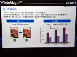 併せて、白色LEDとカラーフィルターの組み合わせにより精細感を向上させた4.5インチ/326ppiの有機ELディスプレイも展示。ほかにも、WhiteMagicによって従来比50%減という低消費電力を実現した4.4型503ppi、フルHDの液晶なども紹介している。