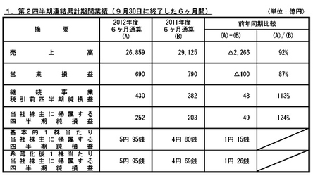 (株)東芝は、2012年度第2四半期の連結決算を発表した。第2四半期連結累計期間は、売上高は2兆6,859億円、営業利益は690億円、当期純利益は252億円。