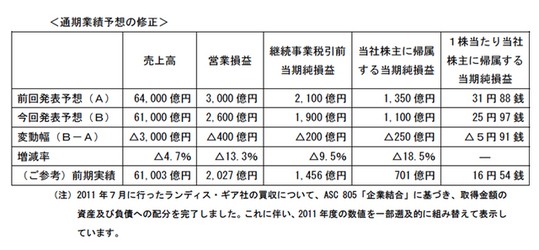 欧州危機や、新興国の成長鈍化、円高継続など景気減速の動きが広がるなか、デジタルプロダクツ部門、電子デバイス部門が前回予想値よりも減収・減益になる見込み。これにともない、通期連結業績予想を修正する。
