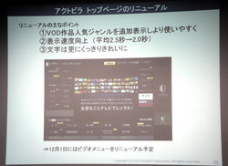 アクトビラのトップページリニューアルも行った。VOD作品の人気ジャンルを追加表示することでより使いやすくしたほか、これまでメニューに画像を使っていたものをテキスト化することで表示速度が平均2.5秒から2.0秒に高速化。さらに文字自体もさらにくっきり、鮮明に読めるようになったという。