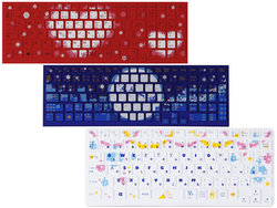 キーボードウェアのデザインは、パーティー、ムーン、ハートの3種類。Bluetoothレーザーマウスは本体の色2色(ブラック、シルバー)とマウスカバーの色(13色)を組み合わせ、計26通りから選ぶことができるほか、オリジナルメッセージを刻印することもできる。