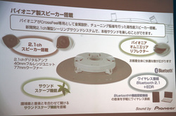 音楽再生機能としては、パイオニアが本機専用に音質設計/チューニング監修を行った2.1chシステムを搭載。アンプは出力20W相当のデジタルアンプを採用し、40mmフルレンジユニットを2基、77mmウーファーを1基搭載。「パイオニア オムニエリア リフレクター」方式が採用されており、部屋全体に均一に音が広がる設計とした。さらに、特許技術によりアンプやスピーカーと壁が設置する面で共振が起こらないよう工夫されているという。