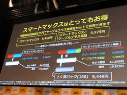 月額9,450円(税込)の「スマートマックス」と、NEC製タブレット「LifeTouch L」をベースに専用の機能を加えた「LifeTouch L for JCN」を4,935円(税込)で購入できる「スマートマックス with タブレット」(月額11,025円/税込 ※2年間経過後は月額9,450円)の2種類を用意している。さらに、JCN電話(ケーブルプラス電話)を月額525円(税込)の追加料金で使用することもできる。