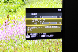なお映画作品では、レンズのボケ味を活かした画作りが多用されるが、ボケ部分をどこまで精細化するかはシャープがICCとは別に独立して開発した「コアリング」という調整値で設定が可能。コアリングも0から10までの10段階調整が可能で、数値は小さければ小さいほどボケ部分が精細化され、数値を上げるとボケ部分を活かした柔らかい映像になる。