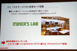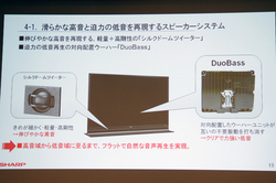 そのほかスピーカーには、シルクドームトゥイーターや2つのウーファーユニットを対向配置することで不要な振動を打ち消し、迫力ある音再生が可能な「DuoBass」を搭載。音声の実用最大出力は35W(10W+10W+15W)となっている。また、(株)ミキサーズ・ラボの内沼映二氏と三浦瑞生氏のチューニングによる音質モード「音楽 ミキサーズラボ」を搭載した。
