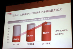 また同社は、大画面テレビ(58V型以上)における4Kモデルの構成比を拡大することをアナウンス。2013年度が約40%と予想し、以降、2014年度には約70%、2015年度には約90%にまで高める予定だ。