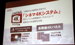 高画質な4Kを支えるのが「シネマ4Kシステム」だ。同社が映像のスペクトル分布を調べたところ、オリジナルの4Kモデルを100%とすると、フルHD映像では精細度が約63%程度に落ちてしまうが、シネマ4Kシステムでアップコンバートすることで精細度が約90%にまで高まるという。同社では「ほぼ4K映像に復元できる」と説明する。説明会会場には3サイズのの試作機をそれぞれ展示し、そのアップコンバートの性能の高さをアピールしていた。