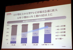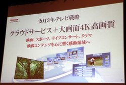 そして、2013年のテレビ戦略は「クラウドサービスと大画面4K高画質」がテーマとする。51V型以上の大型テレビ市場が急速に拡大し、12年下期は11年上期の3倍以上になったと同氏は述べ、「今後も大画面化はますます進む。大画面テレビを戦略商品と位置づけて積極的に取り組んでいく」(深串氏)と宣言した。