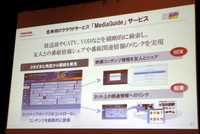 さらに同社は、北米向けのクラウドサービスの展開も発表した。同社はすでに日本国内で「TimeOn」というサービスを展開しているが、今年春、北米市場でもクラウドサービス「Toshiba Cloud TV Services」を開始する。同サービスのなかの「MediaGuide」機能では、STBをコントロールすることで、放送波やCATV、VODなどを横断的に検索することが可能。また友人へ番組情報をシェアしたり、ネット上の関連サイトへのジャンプなども行える。