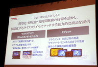 深串氏はPCの商品戦略についても言及。2012年のトピックとしてウルトラブックの市場構成比が上がったこと、タブレットの急速な伸長、Windows 8が登場したことの3点を挙げ、これらのことから2013年はウルトラブック/スリムスタンダードノートPCとタブレットに注力していくと宣言した。