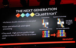 もう一つは今回初めて発表された「次世代クアトロン」技術だ。クアトロンはRGBに加えてイエローのサブピクセルを加えた、4原色の液晶パネル技術。すでに日本でもおなじみのものだが、この次世代版では、特別なサブピクセル信号処理を用いることで、4K解像度に近い精細感を、安価に、従来のパネル製造技術で実現できるという。