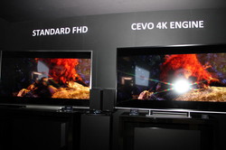 ブースにはまた、「CEVO ENGINE 4K」(国内での名称は「REGZA ENGINE CEVO 4K」)を搭載した84V型の4Kテレビと、フルHDの84V型テレビを並べて置き、4Kアップスケーリング技術の高さをアピール。「デモはどちらも通常のBDを再生していますが、CEVOで処理した4K映像は、元ソースがとてもBDとは思えないとみなさんが驚かれます」(本村氏)。