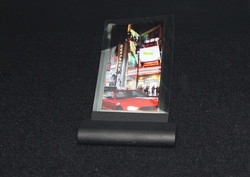デバイスについては、IGZOをTFTに用いた有機ELパネルを展示していた。一つは3.4インチの曲げられるパネルで、半導体エネルギー研究所と共同開発したもの。0.1mm以下の薄さで、質量はわずか2g。曲率は10mmまで。