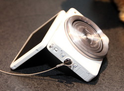 レンズ部分や周りのリング部分は通常のコンデジと同程度のサイズだが、横幅が極端に短い。正方形に近く、これまでのコンデジとはまったく異質なフォルムの製品だ。