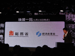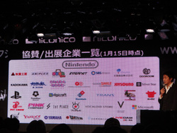 はじめに(株)ニワンゴ 代表取締役の杉本誠司氏が登壇。杉本氏は1月15日時点で、イベントの協賛企業が36社に達したと説明。特別協賛として名を連ねる任天堂(株)をはじめ、協賛企業には最近新しく加わった(株)フジテレビジョンなど5社が並ぶ。さらに後援には作年のイベントもサポートした経済産業省に、今年は総務省が加わることも発表になった。