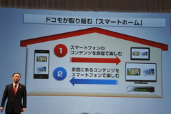 NTTドコモではスマートフォンとオーディオビジュアルを中心としたホーム用ネットワーク対応機器との連携提案をさらに強化していくため、「ドコモ スマートホーム」のコンセプトのもと、ホームネットワークをベースにスマートフォンのコンテンツを家庭で楽しむためのサービス、ならびに録画機などに保存したコンテンツをスマートフォンで楽しむためのサービスを充実させていく。