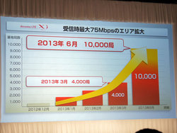 またLTE「Xi」については、受信時最大112.5Mbps/100Mbpsエリアを2013年3月までに22都市に、さらに6月までには50都市以上へと拡大させると説明。「トラフィックの高いところから順次、エリアを一気に拡大していく。通信速度が高まっていることを日々実感していただけると思う」とした。