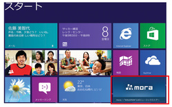Windows 8において、Windowsストアから本アプリをダウンロードしてインストールすると、画面に「mora」の「タイル」が表示される。この「タイル」をタップすることで、「デスクトップ」に切り替えることなく、Windows 8ならではの操作性で「mora」を利用することができる。