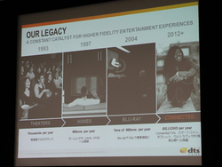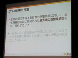 小玉氏はdts Japanの役割を「世界市場で活躍する日本の家電業界に対して、民生用機器向けに開発された最先端の音響技術を紹介、提供すること」「一般の人々にDTS技術を使用したプレミアムサウンドを実際に体験してもらい、DTSブランドを確立していくこと」と紹介した。