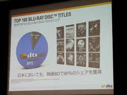 また、全米におけるBDソフト売上TOP100の89%がDTS-HD Master Audioを採用していることや、日本でも映画BDソフトの分野で90%のシェアを獲得していることも紹介された。