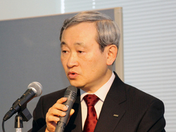本日行われた3社合同の記者発表会では、KDDI 理事 技術統括本部 技術開発本部長 渡辺文夫氏、KDDI研究所 代表取締役所長 中島康之氏、ジュピターテレコム 取締役 技術部門長 山添亮介氏が登壇し、今回の実験と技術について概要を説明した。また、会場では実際に伝送のデモも実施。練馬にあるJ:COMの施設と、記者発表会場となった丸の内のオフィス間で社内用のネットワークを使用した伝送実験を行った。