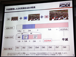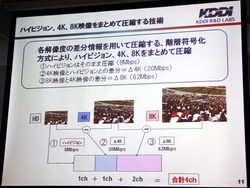 映像コーデックにはKDDIが独自に開発した新技術を採用している。先日ITUで国際標準規格として承認されたHEVCに比べても圧縮効率が高いという。今回の実験ではこの新コーデックを用いて、8K映像を62Mbps、4k映像を20Mbps、フルHDを8Mbpsでエンコードし、伝送した。