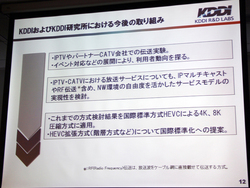 技術の詳細説明を行ったKDDI研究所の中島氏は、今後の取り組みについて「CATVやIPTVを使った伝送実験を今後とも行い、イベント展開して利用者の動向も探っていきたい。また、放送サービスについても、IPマルチキャストやCATVのRF伝送を含め、ネットワーク環境の自由道をいかしたサービスの実用化を検討していく」と説明した。