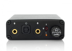 前面パネルには3段階のゲイン調整に加え、ALO Audioのロゴがプリントされたボリュームノブを配置している。