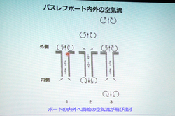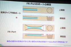 「FR-Port(Flat Radial Port)」は、スピーカーの内部にバスレフポートを配置。その形状も、側面から見るとまっすぐだが、上から見ると両端が末広がりになっている。「(図の)黄色い部分の空気のバネと青い部分の空気の質量でヘルムホルツ共鳴を起こす。このバスレフポート形状は、気流が自然に横方向に向かうので、ポートのなかで気流を広げて押しつぶす感じになる。そのため、空気はポート内部で振動し、ポート開口部には空気流が出てこなくなる」と説明する新井氏。ポート開口部をパンチングメタルで塞いだ場合、パワーを増やすほど抵抗が増え効率が下がってしまうが、FR-Portは効率が100%のままで変化しないというメリットがあるという。