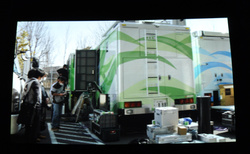 4K撮影の映像は味の素スタジアムに派遣した衛星中継車から送信し、お台場メディアージュのビル屋上に設置したアンテナで受信。シアター常設の4Kプロジェクターで投映した。なお回線容量は約120Mbps、映像圧縮はH.264/MPEG-4 AVCで行い、4K/60pの映像を伝送した。アンテナには今回、可搬型の高い小型のものを使っている。