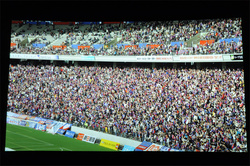 カメラはメインにキヤノン「C500」と「30-300 CineLens」の組み合わせを3台用意。1台はスタジアム全体を見渡せるメインカメラに、もう1台はセンターカメラに配置して、試合中はピッチ全体の様子やボールの動きを4Kで余すところなく捉える。今井氏は「今回は400インチのシネマスクリーンを使っているため、なるべく画角を広くとって、多くの選手が写せるようなセッティングにした」という。またスタンドからピッチを鋭角に捉えるメインカメラの1台として、アストロの「AH-4413」も使われた。そしてもう1台のキヤノン機は、ピッチをタテ位置で撮るカメラとして配置し、コーナーキックやリプレイ映像の撮影の他、選手たちの表情を捉まえるためのカメラとした。