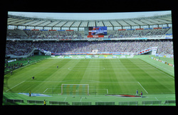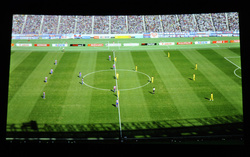 今回の実験は、調布・味の素スタジアムで実施されたJ1リーグ戦「FC東京 対 柏レイソル」の試合生中継を、お台場メディアージュのシアターへ伝送。シアター会場に集まった関係者・プレス向けに公開された。