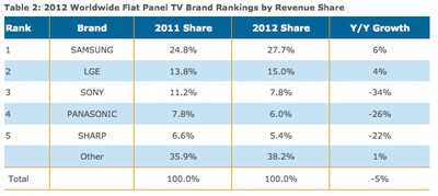 薄型テレビのメーカー別世界シェアは、サムスン電子が前年比6%の成長を見せ、全体の27.7%を占め1位。さらにLG電子が同4%の増加で15%を占め2位に続いた。3位はソニーで、シェアは前年同期比マイナス34%と大幅減の7.8%。続くパナソニックが同マイナス26%の6.0%で4位、シャープが同マイナス22%の5.4%で5位となった。